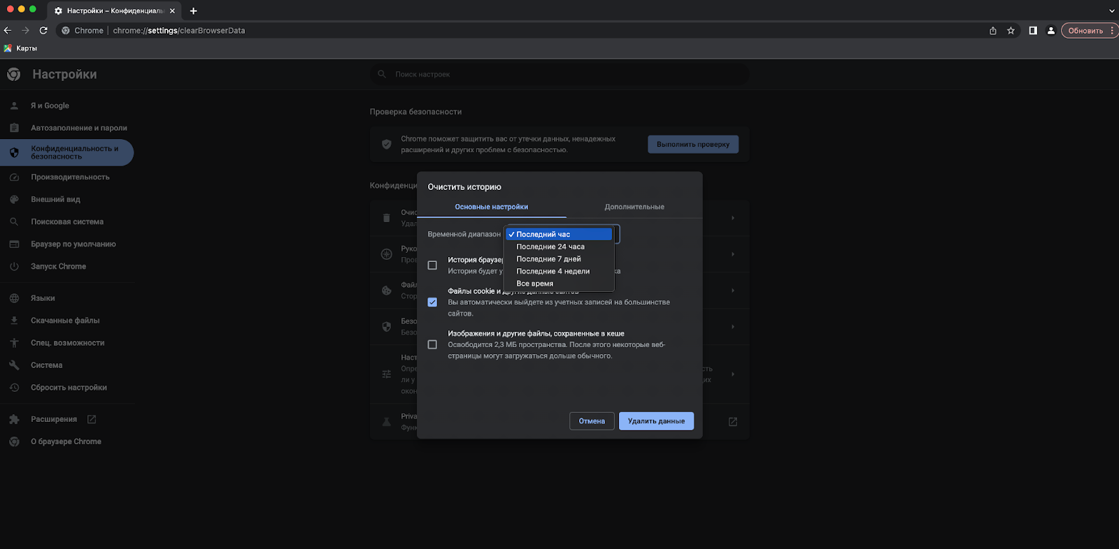Можно выбрать временной диапазон для удаления: за все время, неделю, месяц и т. д.