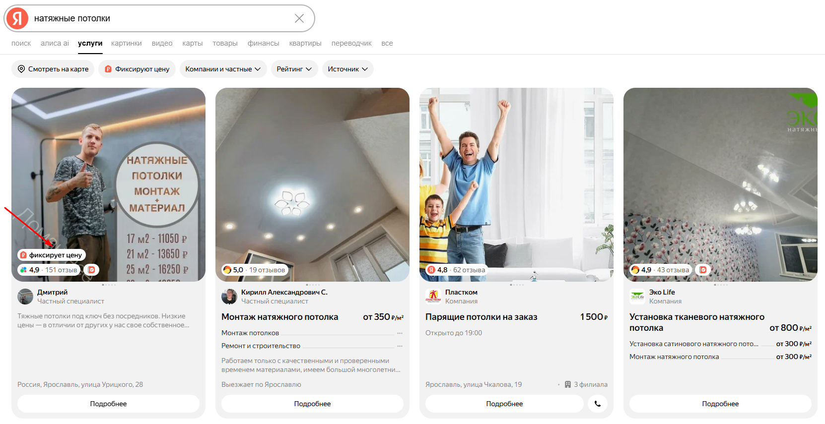 Дополнительно Яндекс выделяет карточки знаком «Фиксирует цену», чтобы было проще планировать бюджет.