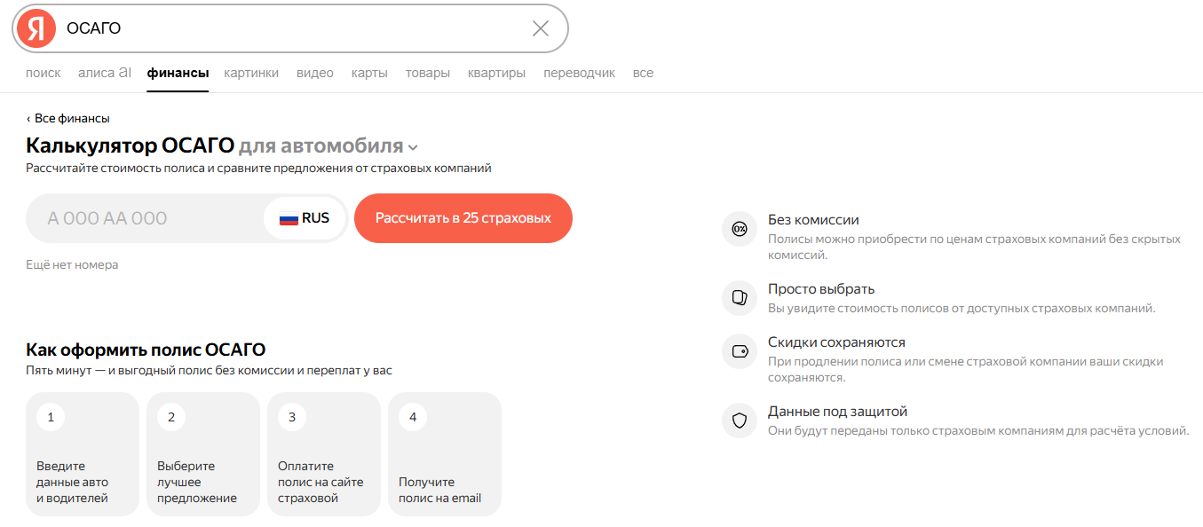 Поиск в этой категории позволяет сравнить финансовые и банковские продукты, рассчитать кредит по параметрам и даже получить предварительное одобрение.