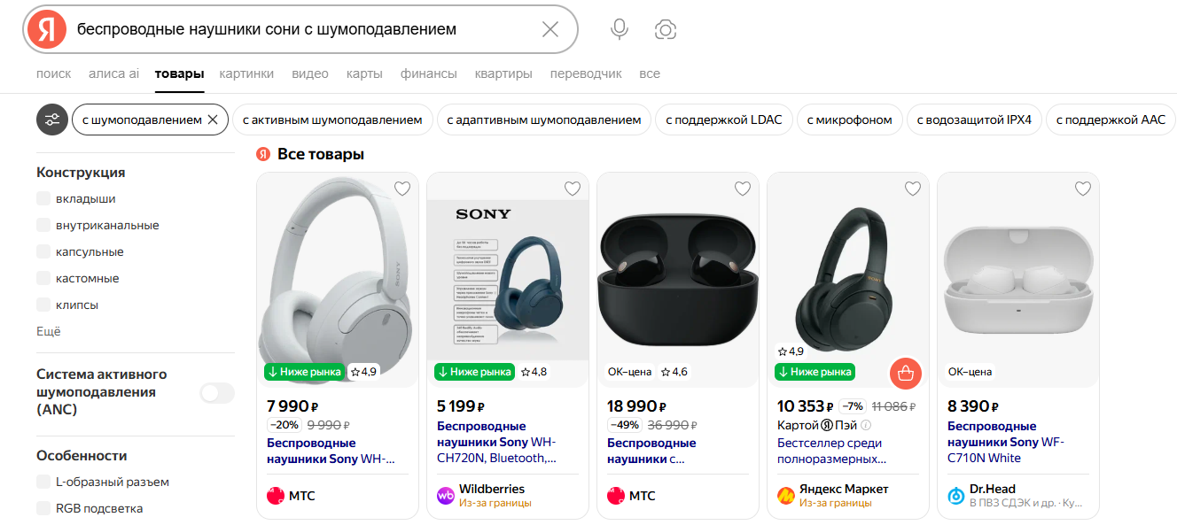 В этом разделе можно выбрать товар по заданным параметрам, проверить цену, попросить Алису найти скидку и сразу перейти к покупке. Фактически это не поиск, а полноценная витрина с фильтрами и возможностью для транзакции.
