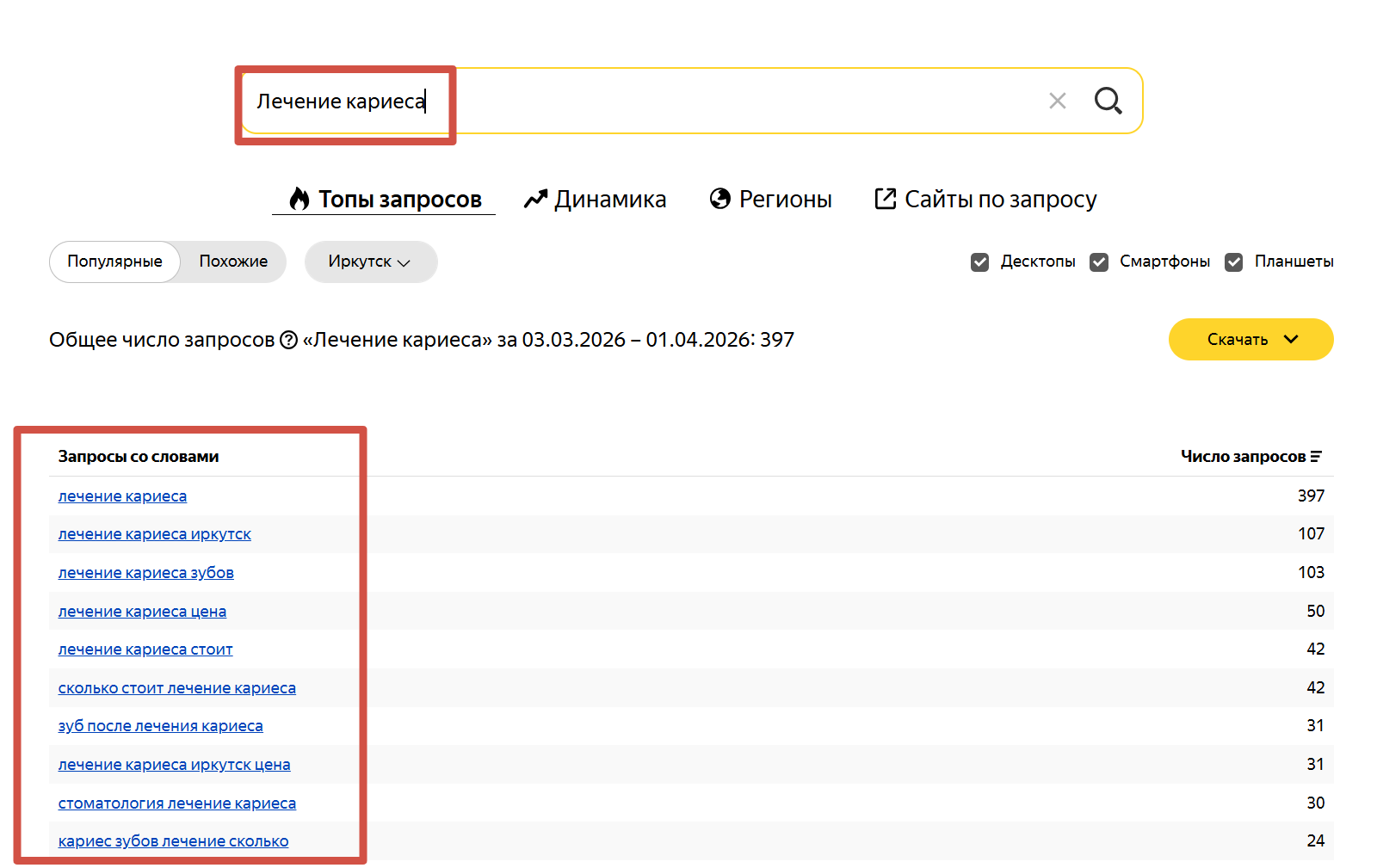 - Собирают маркерные, или базовые фразы по всем направлениям: услуги, симптомы, география, бренд. Например, «лечение кариеса», «Смайл стоматология».