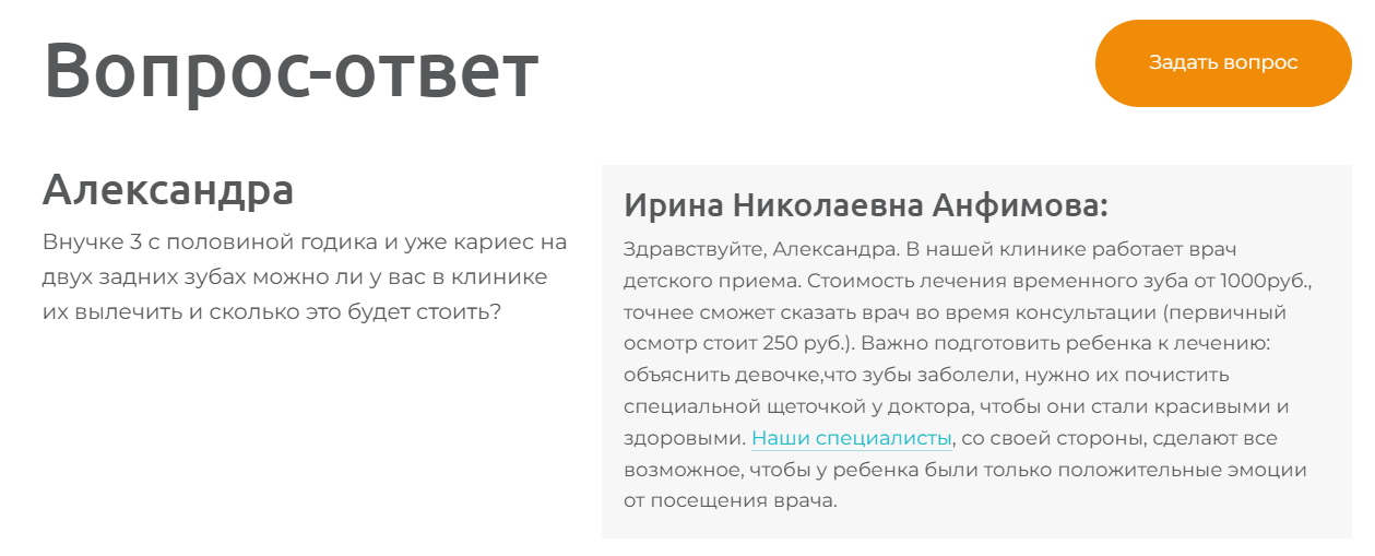 Хорошо работает блок ответов на частые вопросы (FAQ) — нейросети любят четкий формат «вопрос-ответ» и охотно берут из него информацию. Но вопросы должны быть конкретными (например, «принимаете ли вы по ДМС?» или «лечите ли корневые каналы под микроскопом?»), а не расплывчатыми («что у вас есть?»).