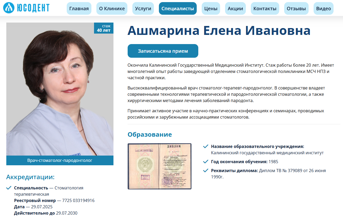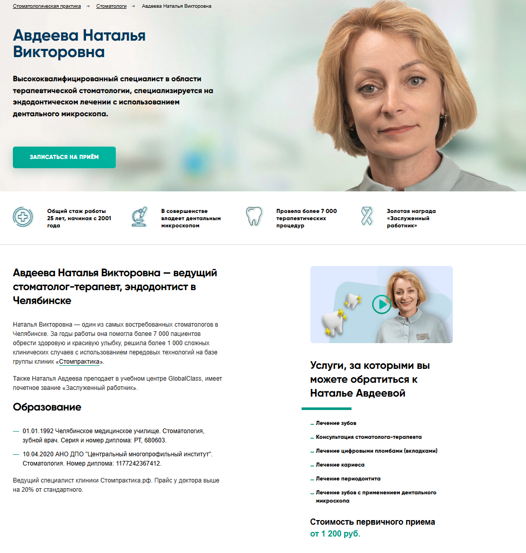 Приведем пример сайта стоматологии, который соответствует перечисленным выше критериям. У каждого врача есть отдельная страница с подробной информацией, фото и видео: