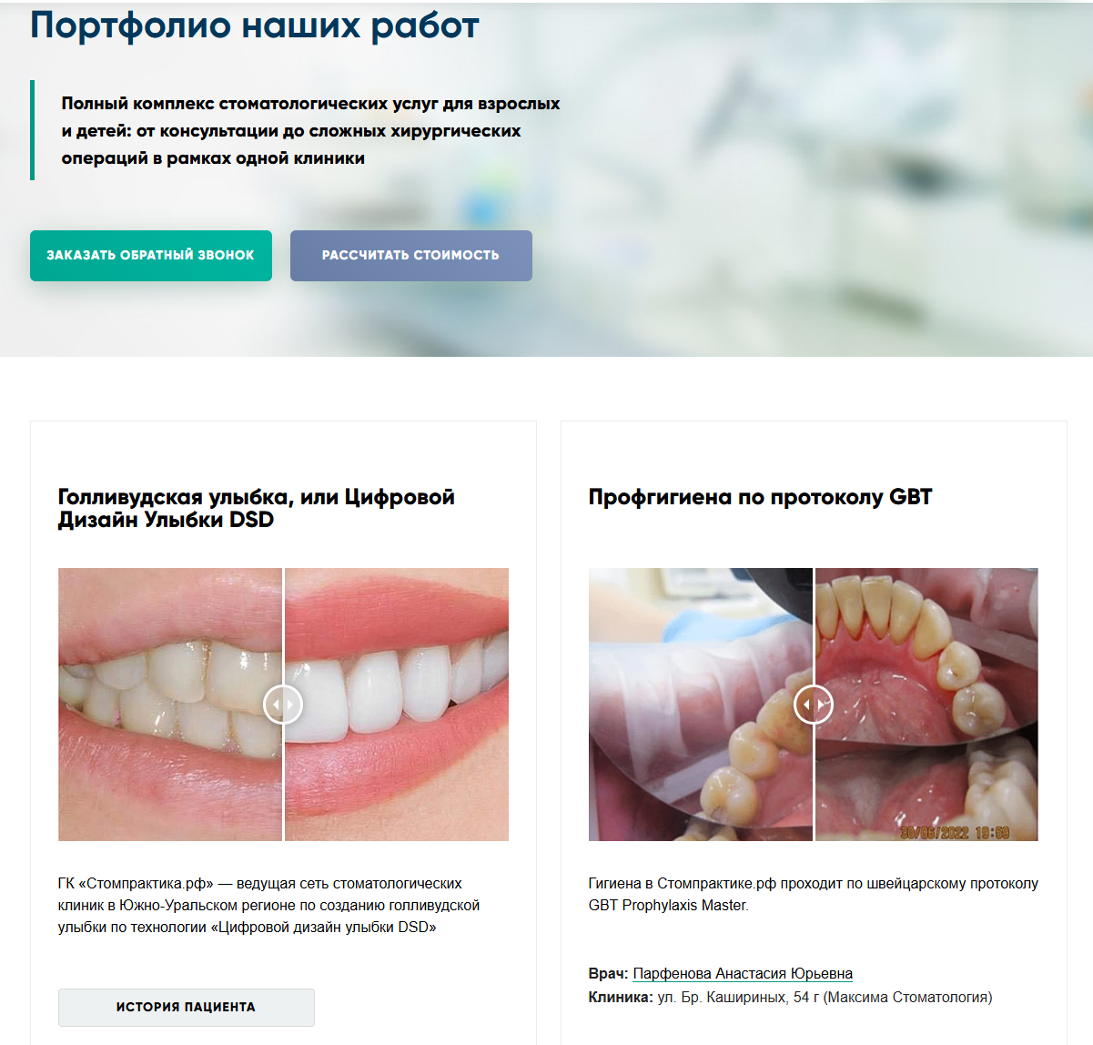 Есть кейсы с фото, историей пациента и ФИО врача: