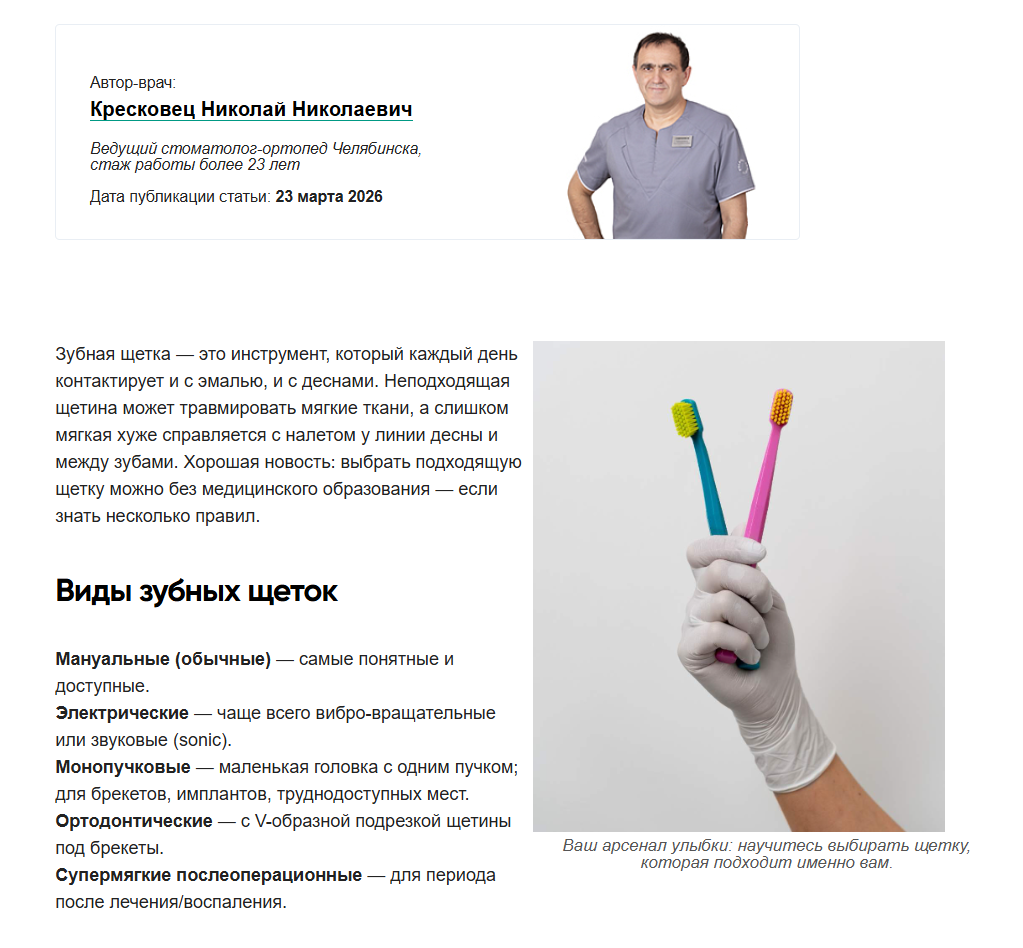 | Информационные | Ответы на вопросы, симптомы, причины | «Кровоточат десны причины», «Какую зубную пасту выбрать» | Экспертные статьи, ответы на частые вопросы, советы врачей |