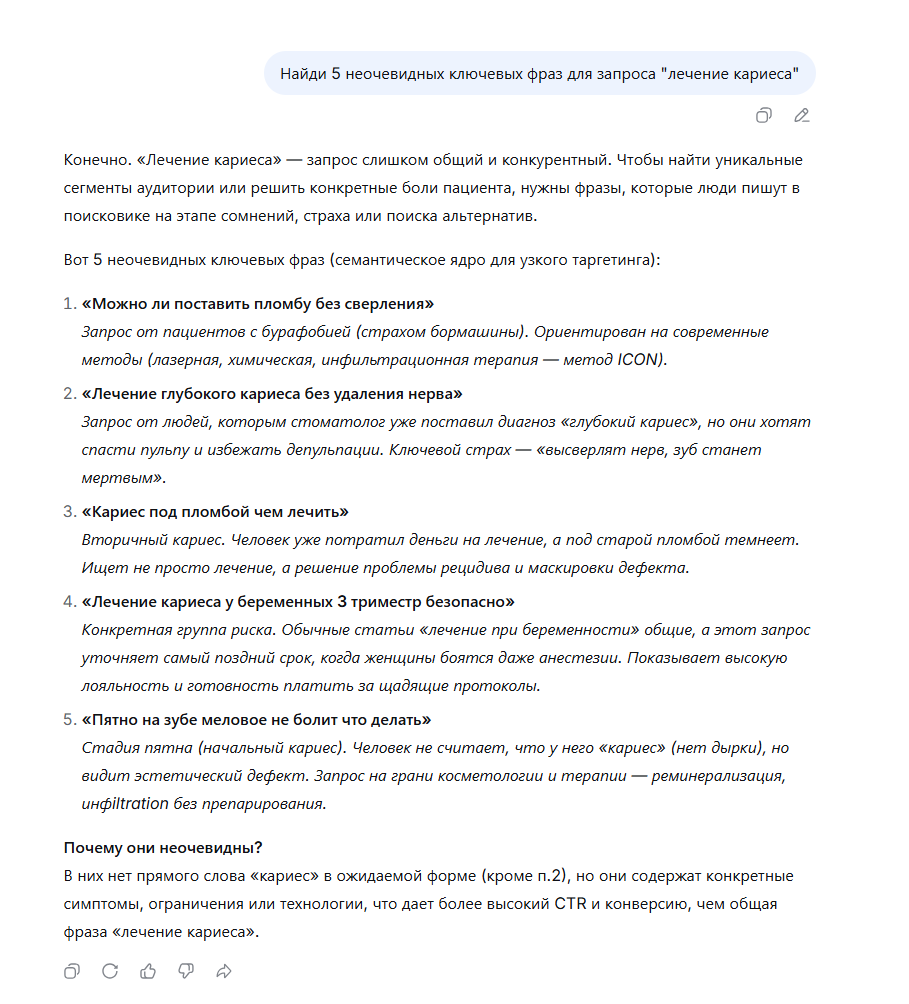 Также можно использовать ИИ инструменты. В промпте укажите: «найди 20 неочевидных ключевых фраз для запроса [ваш запрос]». Нейросеть сгенерирует список идей, которые помогут расширить семантику. Но обязательно проверьте каждую фразу в Вордстате. ИИ может предложить красивые, но непопулярные варианты, по которым никто не ищет.