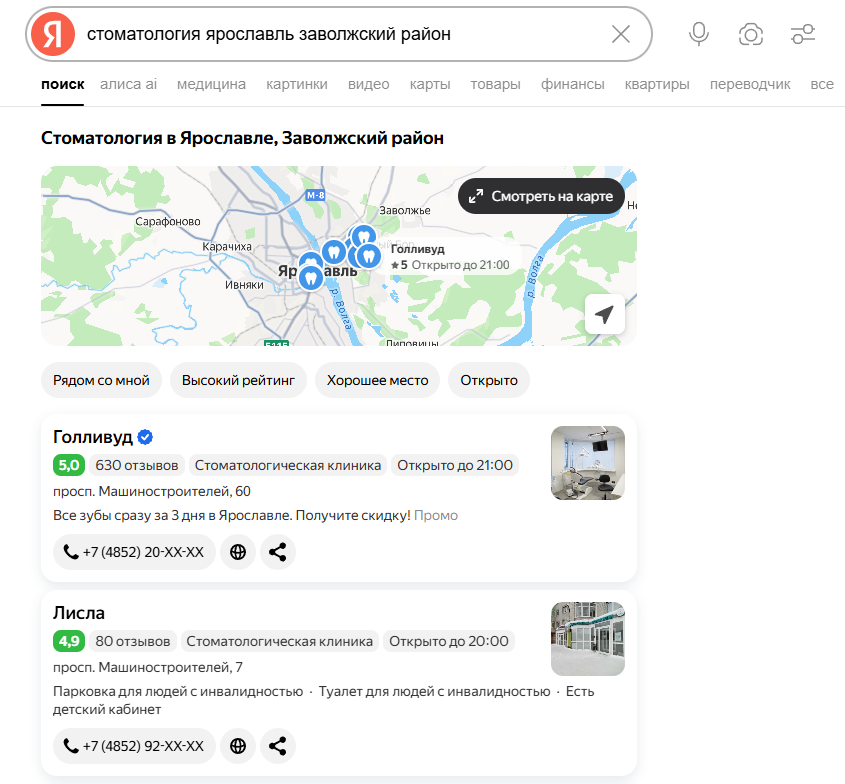 Карты — это не только положительный сигнал для алгоритмов, но и значимый канал продаж. 60–50% обращений в стоматологии приходят из карт. Пациент находит клинику поблизости и может записаться, даже не заходя на сайт.