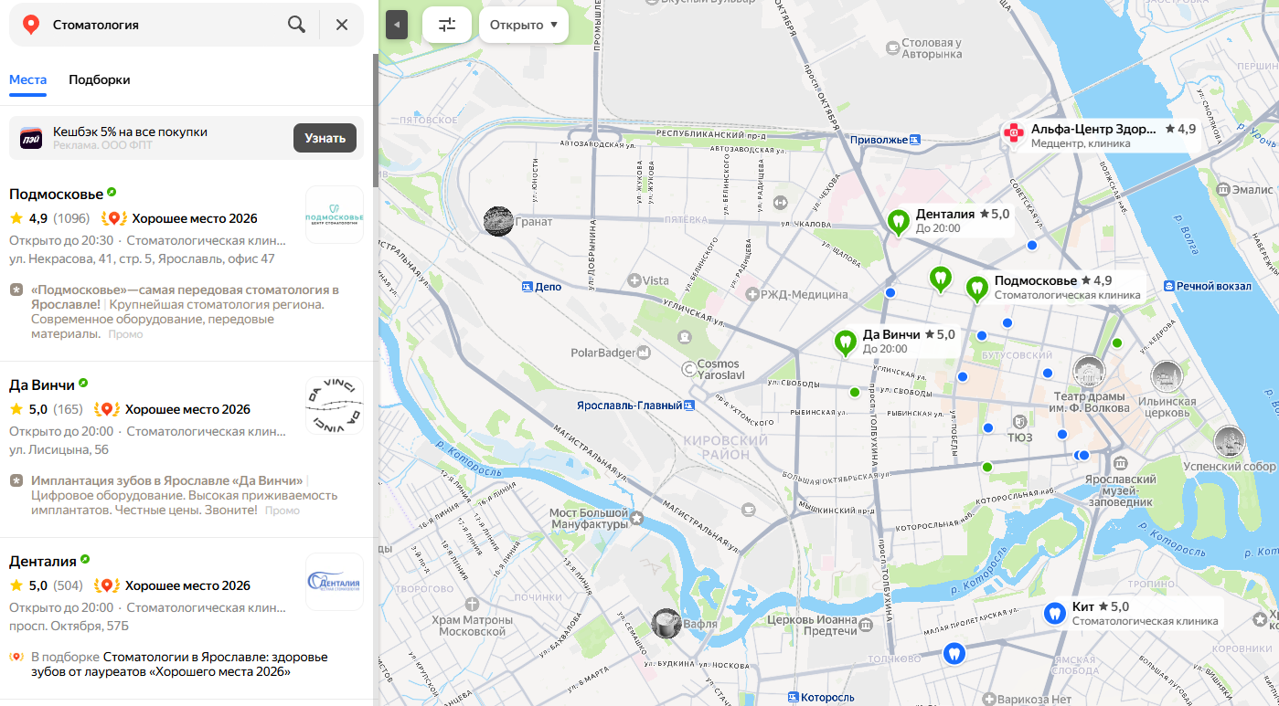 Если человек ищет стоматологию, алгоритмы понимают, что ему нужен врач поблизости. Так работает локальная выдача. Для клиники это особенно важно, потому что большинство людей хотят записаться на лечение рядом с домом или работой.