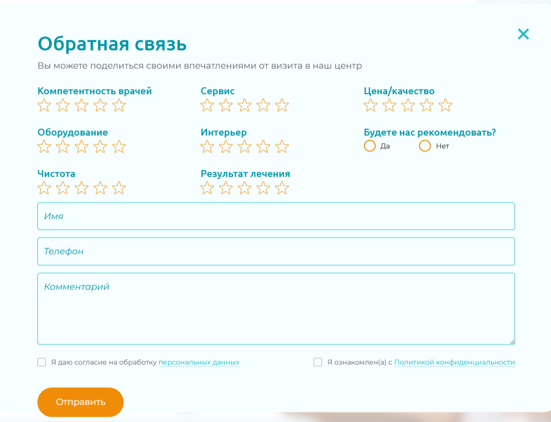 - Сделайте на сайте специальную форму с просьбой оставить отзыв. Можно вывести виджеты агрегаторов, где представлена клиника (Яндекс Карты, ПроДокторов и т. д.).