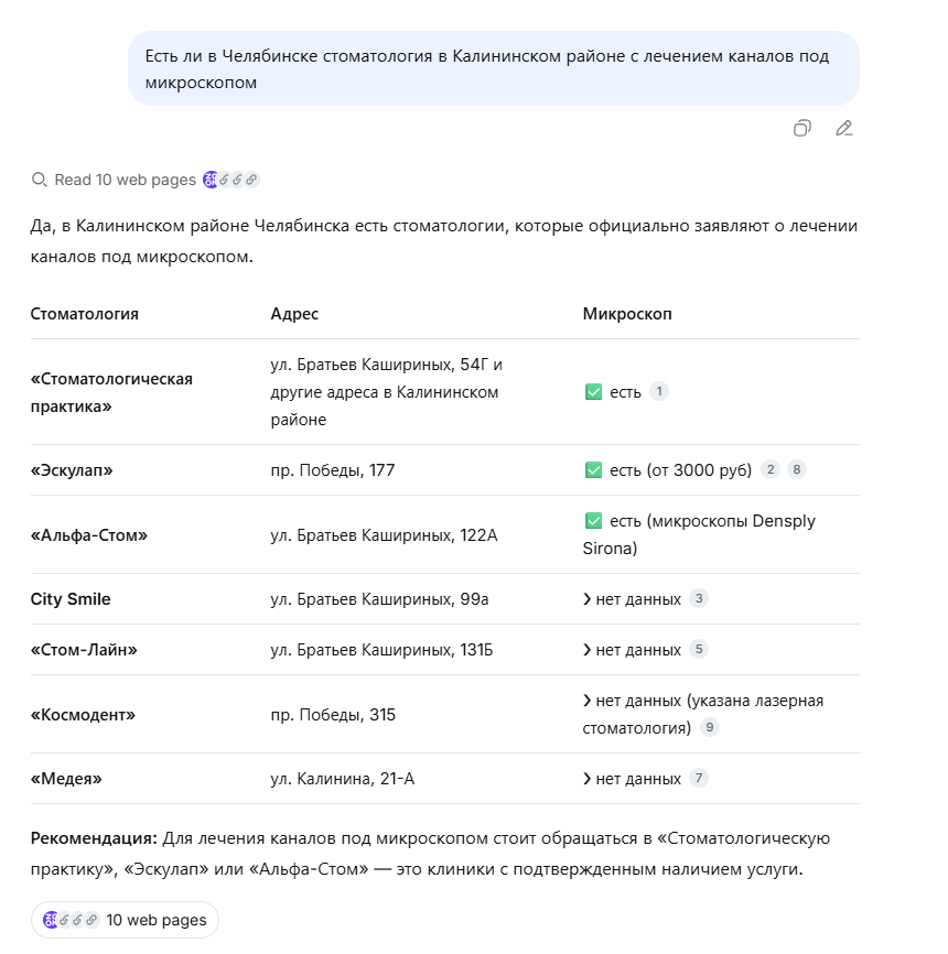 Если вашей клиники в ответе нет, значит, AI не нашел достаточно подтвержденных данных о ней или ее услугах. Например, вы не указали, что работаете в Калининском районе или что используете микроскоп при лечении каналов.