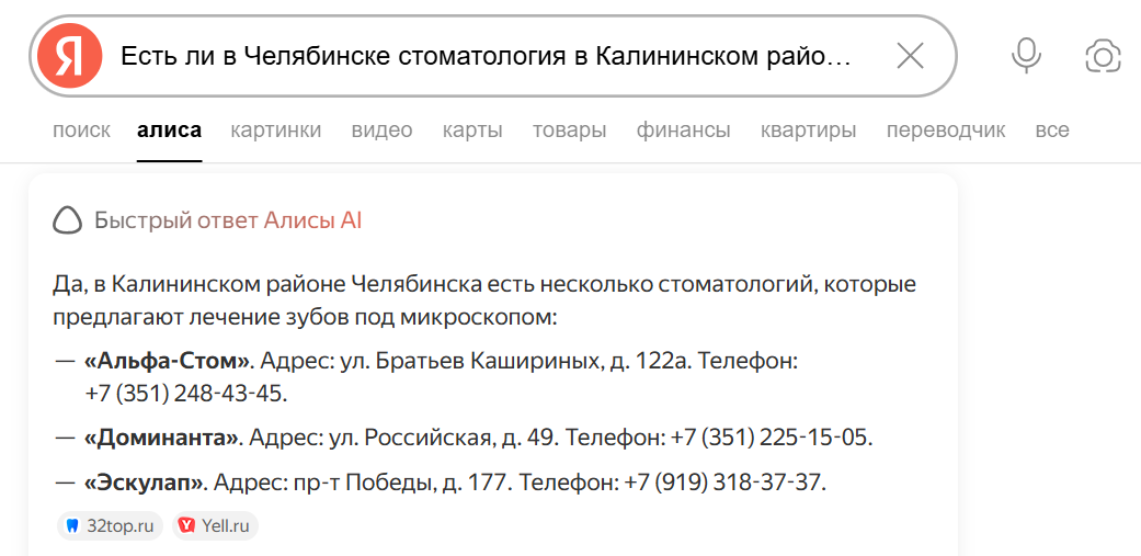 На практике это выглядит так. Пользователь пишет запрос: «есть ли стоматология в Челябинске в Калининском районе с лечением каналов под микроскопом». Нейросеть выдает список клиник.