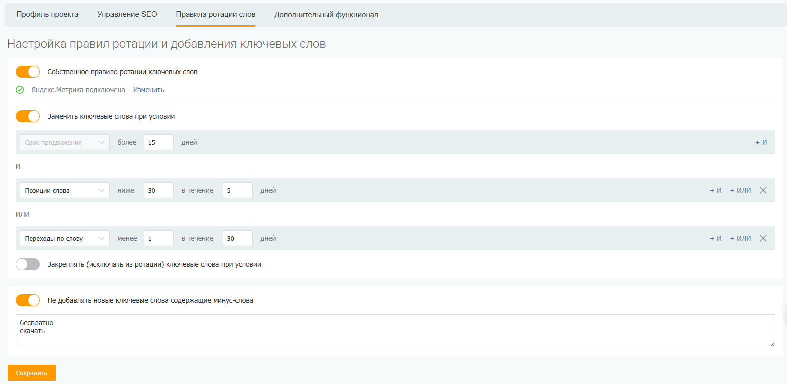 Можно настроить свои правила автоматической ротации ключевых слов — заменять слова, которые не приносят трафик или не выходят в топ в течение заданного времени, добавлять минус-слова, закреплять результативные фразы и прочее.