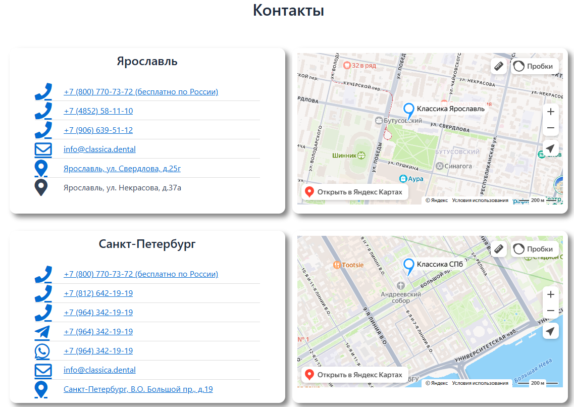 - Если у клиники несколько филиалов, для каждого создайте свою страницу с уникальным текстом, схемой проезда, фото входа и фасада.