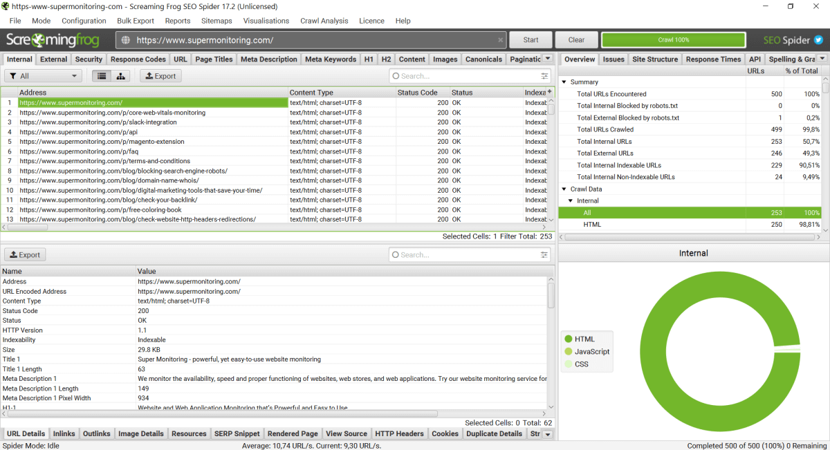 Десктопная программа от российских разработчиков. По основным функциям схожа с зарубежными аналогами: анализирует метаданные и дубликаты страниц, ищет битые ссылки, строит визуальную структуру сайта и позволяет сгенерировать файл sitemap.xml.