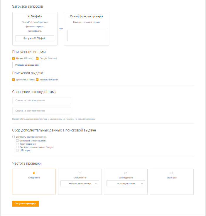 Онлайн-инструмент «Съем позиций в поисковиках» позволяет собрать позиции сайта и сравнить их с позициями конкурентов. Дополнительно можно собрать данные сниппетов, чтобы увидеть, как сайт отображается в выдаче. Снимать позиции можно разово, ежедневно, еженедельно и ежемесячно.
