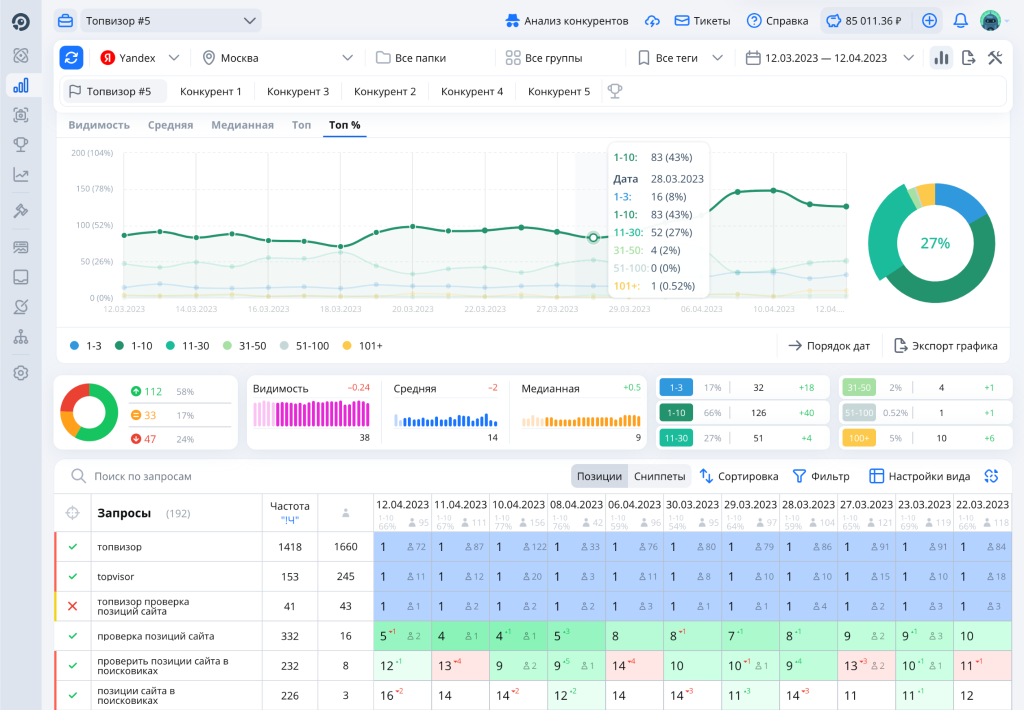 Онлайн-сервис, который собирает позиции сайта в Яндексе и Google по заданным запросам. Дополнительно здесь можно посмотреть частотности слов, найти основных конкурентов, получить снимки выдачи. Также в Топвизоре есть инструменты для технического анализа сайта и генерации Sitemap.