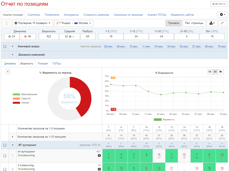 В Rush Analytics есть инструмент для сбора и анализа позиций сайта. Здесь можно посмотреть позиции по каждому слову, увидеть список поднявшихся и опустившихся позиций, оценить общую видимость сайта. Отдельно можно посмотреть видимость конкурентов.