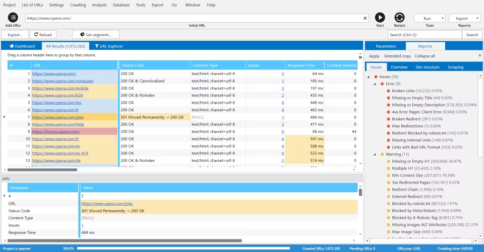 Инструмент, похожий на Screaming Frog SEO Spider. Анализирует сайт по 100+ параметрам. Среди них содержимое метатегов, битые ссылки, веса страниц и т. д. Подходит для работы с большими веб-ресурсами, так как позволяет анализировать конкретные части сайта и получать только нужные данные, отфильтровывая лишние. Предоставляет удобный pdf-отчет по результатам сканирования.