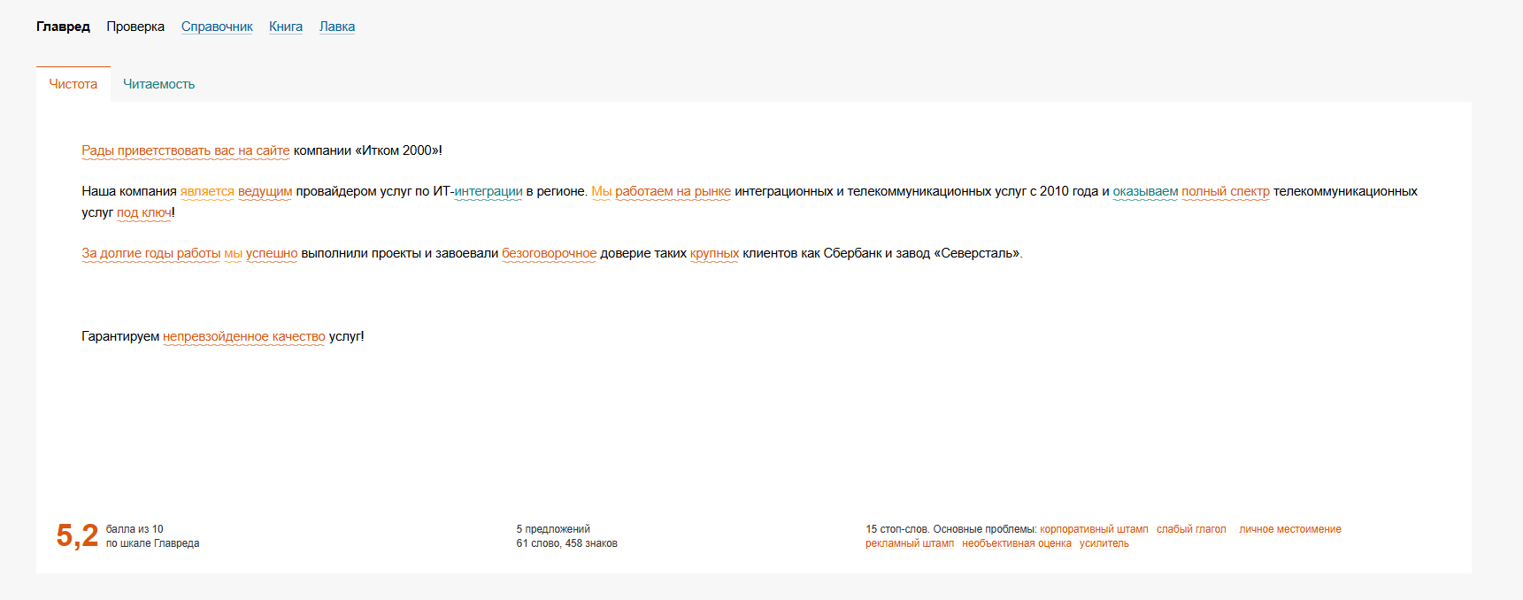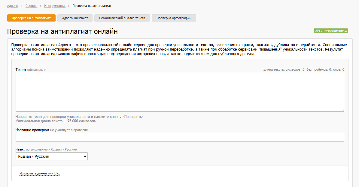 У биржи контента Advego есть несколько бесплатных внутренних инструментов для работы с текстами: проверка уникальности, SEO-анализ и Advego Лингвист (проверка качества текста, наличия канцеляризмов и общих фраз). Все инструменты подходят для работы с большими текстами до 100 000 символов.