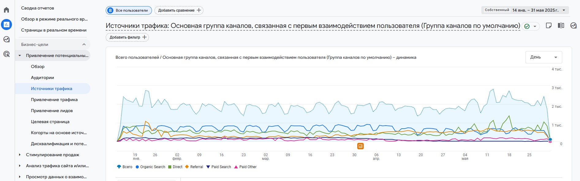 Система аналитики от Google. По функционалу во многом похожа на Метрику, но отличается более мощными инструментами для анализа аудитории и визуализации данных. Например, можно оценить и сравнить вовлеченность пользователей смартфонов и ПК. На российских сайтах код Google Аналитики размещать с 1 июля 2025 нельзя, это связано с трансграничной передачей данных россиян.