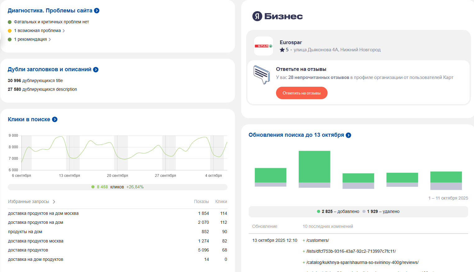 Бесплатный SEO инструмент, полезный в первую очередь для вебмастеров и SEO-специалистов. С его помощью можно оценить техническое состояние сайта и то, как он индексируется в Яндексе. Например, проверить скорость загрузки страниц или корректность файла robots.txt. В Вебмастере также можно проверить и при необходимости настроить региональную привязку сайта. Это важно для локальных компаний — кафе, автосервисов и подобных.