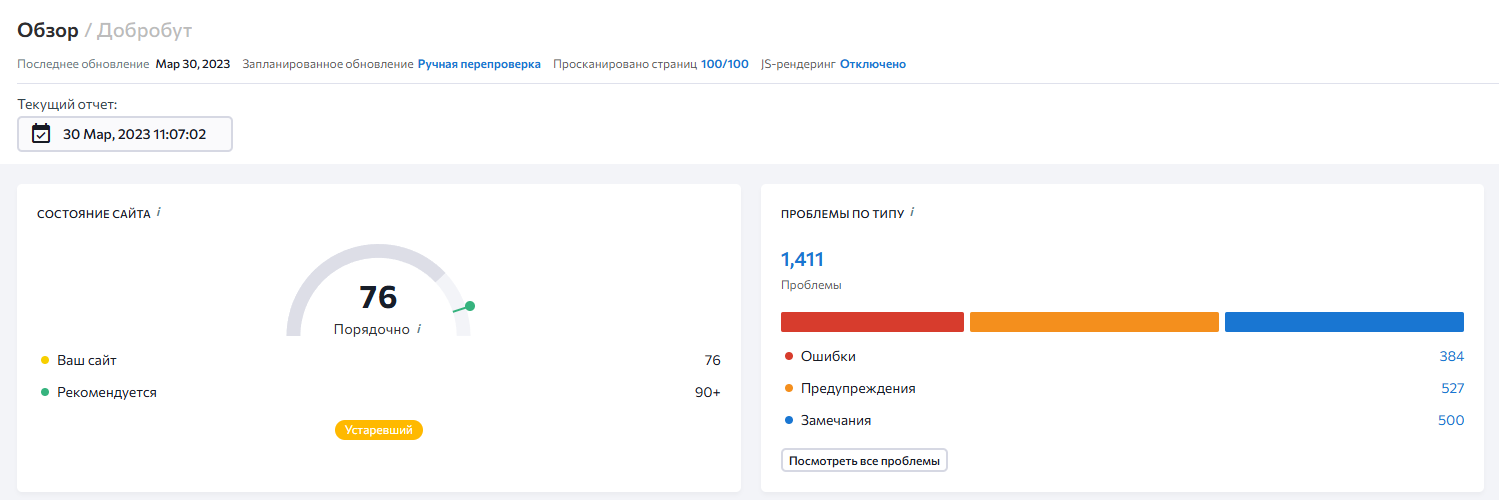 Онлайн-сервис для поиска ошибок на сайте. Анализирует метатеги и html-код страниц, мультимедийные файлы (в частности изображения), редиректы и другие технические параметры. Все ошибки разделяются на четыре группы в зависимости от их влияния на индексацию и ранжирование в поиске: от высокого приоритета до низкого и малозначимого (информационного).