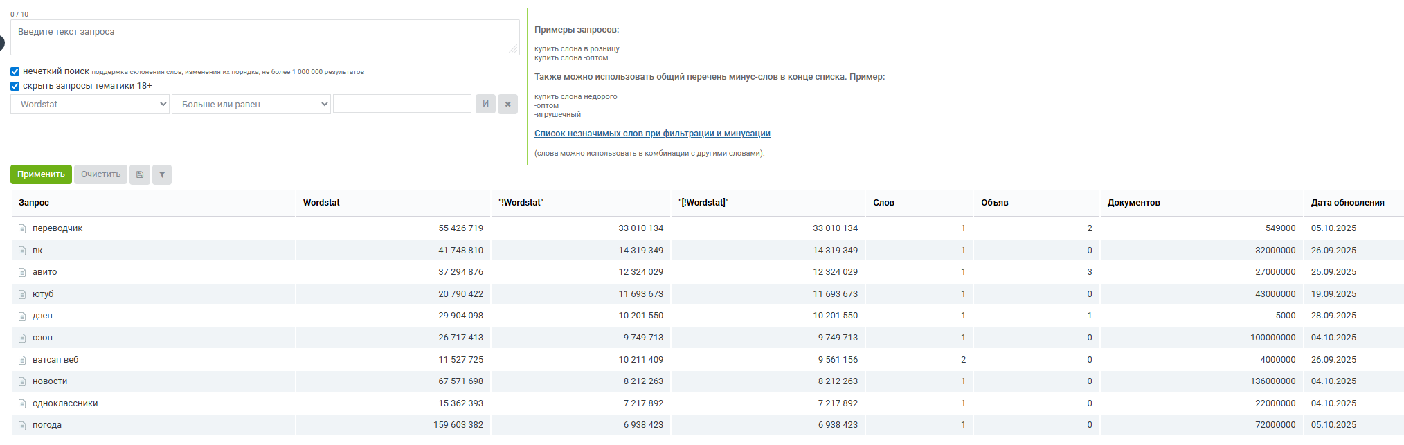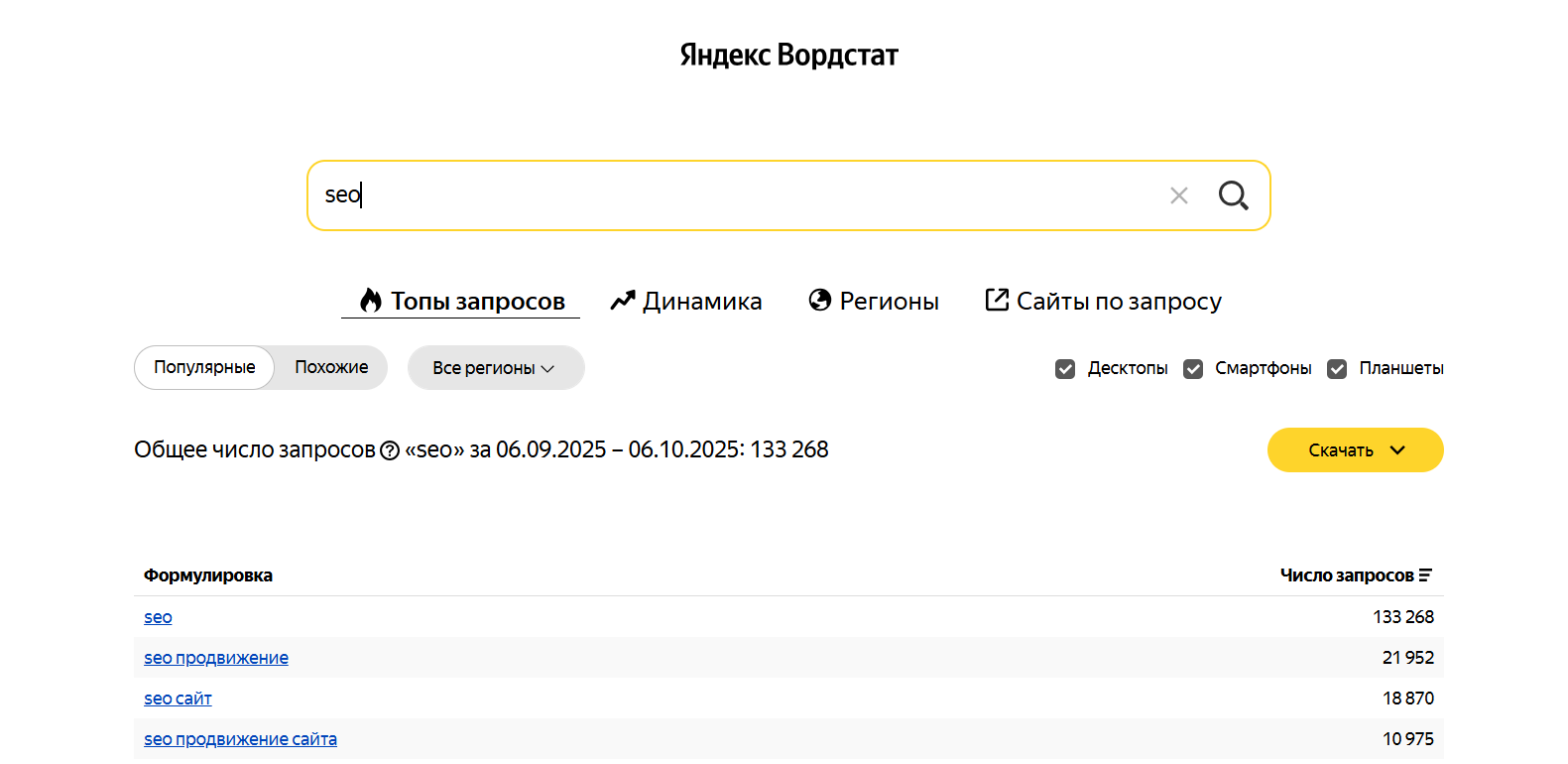Бесплатный инструмент от Яндекса, который помогает собрать базовые ключевые слова для продвижения сайта. Показывает популярные поисковые запросы пользователей по заданной теме и определяет их частотность. Позволяет фильтровать запросы по регионам и устройствам, а также показывает динамику изменения частотности.