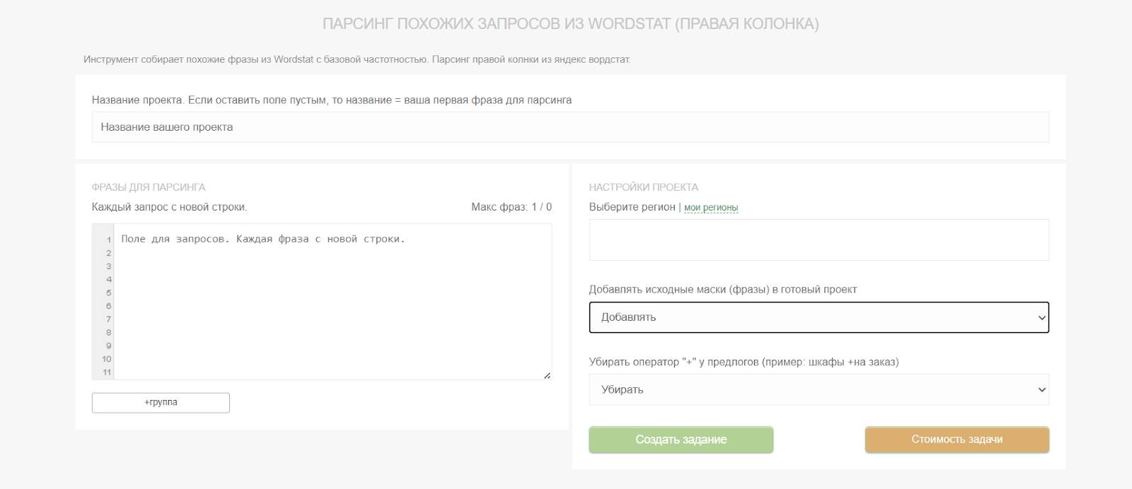 Онлайн-сервис включает парсер фраз и дополнительные инструменты: сбор частотности, кластеризатор, определение релевантных запросу страниц, парсинг поисковых подсказок. Доступен и подбор поисковых запросов по url-адресу сайта или адресам конкурентов.