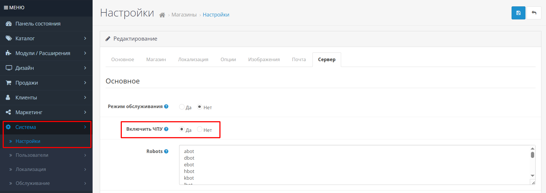 - Включены ЧПУ (SEO URL) в настройках админки.