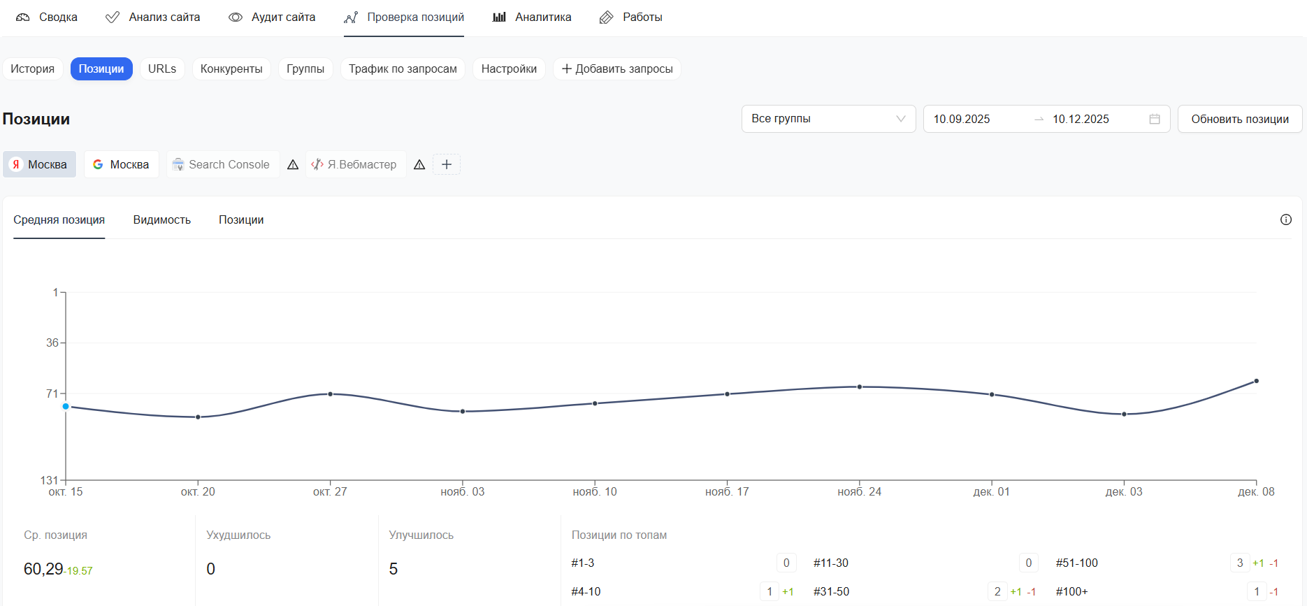 Многофункциональная SEO-платформа, в которой есть инструмент для съема позиций.