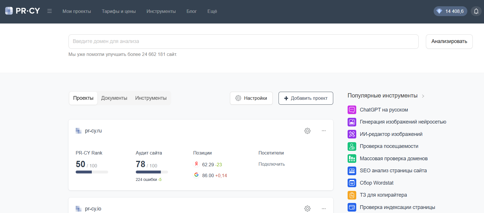 Русскоязычный сервис с инструментами для SEO-специалистов и вебмастеров. Одна из функций сервиса — съем позиций в Google и Яндексе.