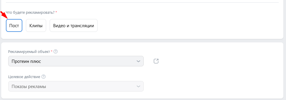 - Выбрать объект рекламы — пост. Указать ссылку на сообщество ВК. Целевое действие выбирается автоматически в зависимости от целей кампании и объекта.
