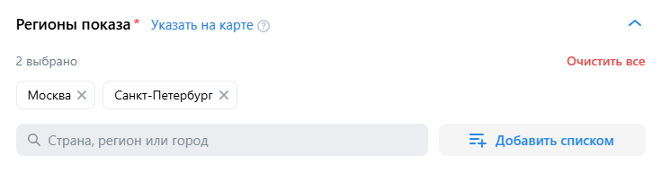 - Регион показа. Выбираются города и регионы из списка или указываются на карте. Также регионы можно загрузить файлом в формате CSV или TXT.