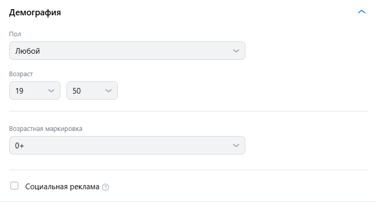 - Демография. Здесь настраивается показ рекламы на аудиторию конкретного пола и возраста.