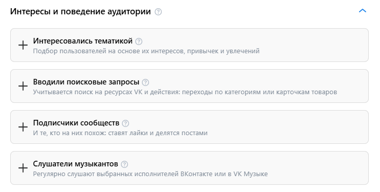 - Интересы и поведение аудитории. Можно настроить таргетинг на людей, которые интересовались вашей тематикой, вводили определенные поисковые запросы или слушали конкретных музыкантов и т. д.