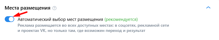 - Места размещения. По умолчанию задан автоматический выбор мест размещения. Это позволяет расширить охват аудитории и показать рекламу в соцсетях, рекламной сети и проектах ВК.