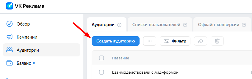 1. В левом главном меню перейти в раздел «Аудитория» и кликнуть на «Создать аудиторию».