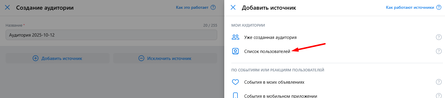 - Аудитории. Загружается собственный список потенциальных клиентов, которым нужно показать рекламу.