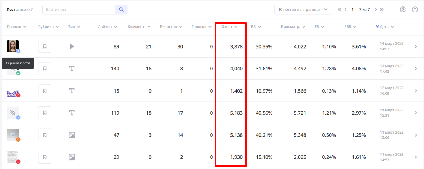 - Анализ охвата в разрезе постов. Также наряду с этим посты оцениваются и по другим важным метрикам, в том числе по просмотрам, ER, ERR и т.д.