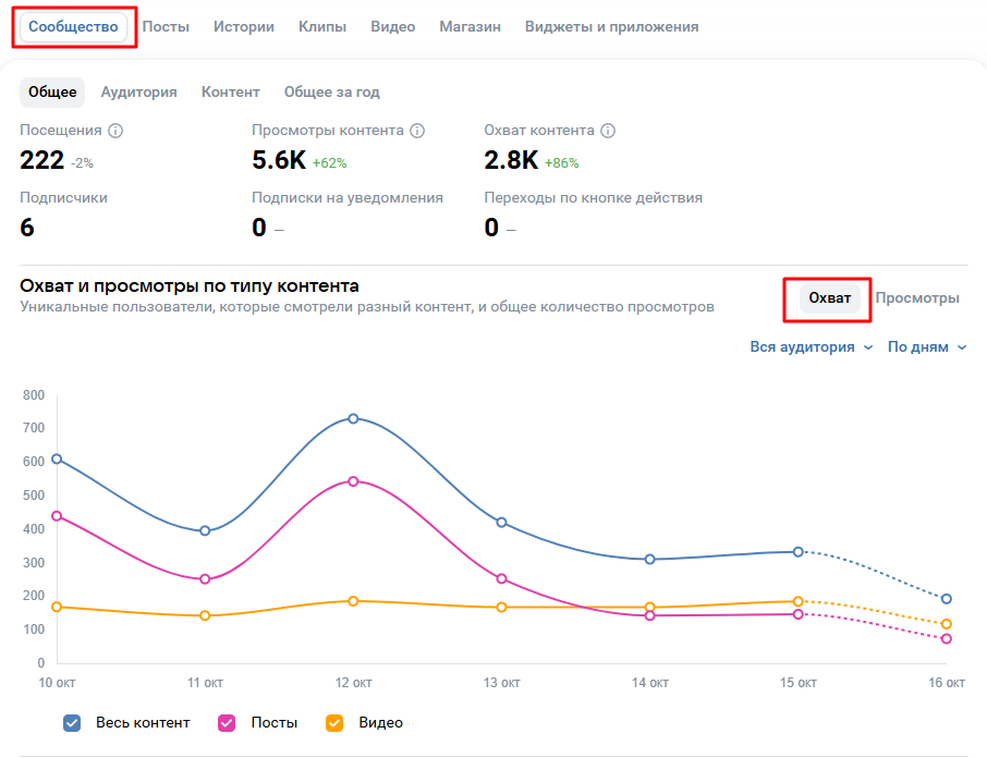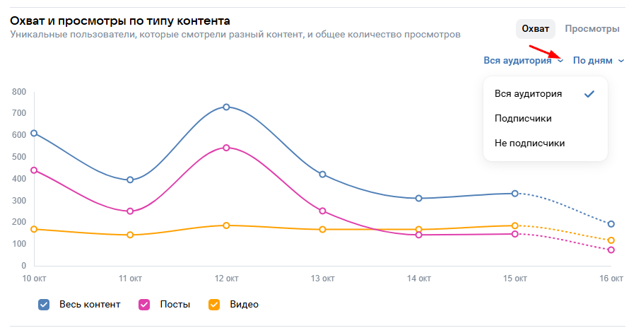 Внизу под дашбордом расположен график, на котором отображается охват и просмотры в ВК. Для просмотра статистики по охвату нужно перейти на вкладку «Охват». В этом случае на графике отобразится динамика полного охвата, охвата подписчиков и вирального охвата за выбранный период.