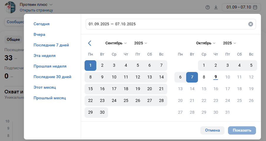 Это позволяет анализировать охват за сегодняшний или вчерашний день, последние 7 дней, текущую или прошлую неделю, последние 30 дней и т. д. Также можно выбрать любой необходимый период анализа в календаре.