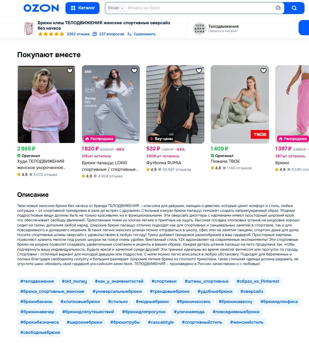 Первый российский маркетплейс, который запустил бесплатное продвижение и категоризацию ассортимента с помощью хештегов — Озон. Здесь они работают так же, как и в соцсетях: покупатели нажимают на активные слова или фразы в карточке товара и переходят на подборку всех продуктов по тегу.