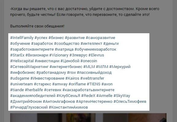Пример, как делать нельзя: такие посты с десятками тегов просто не будут индексироваться в ВК