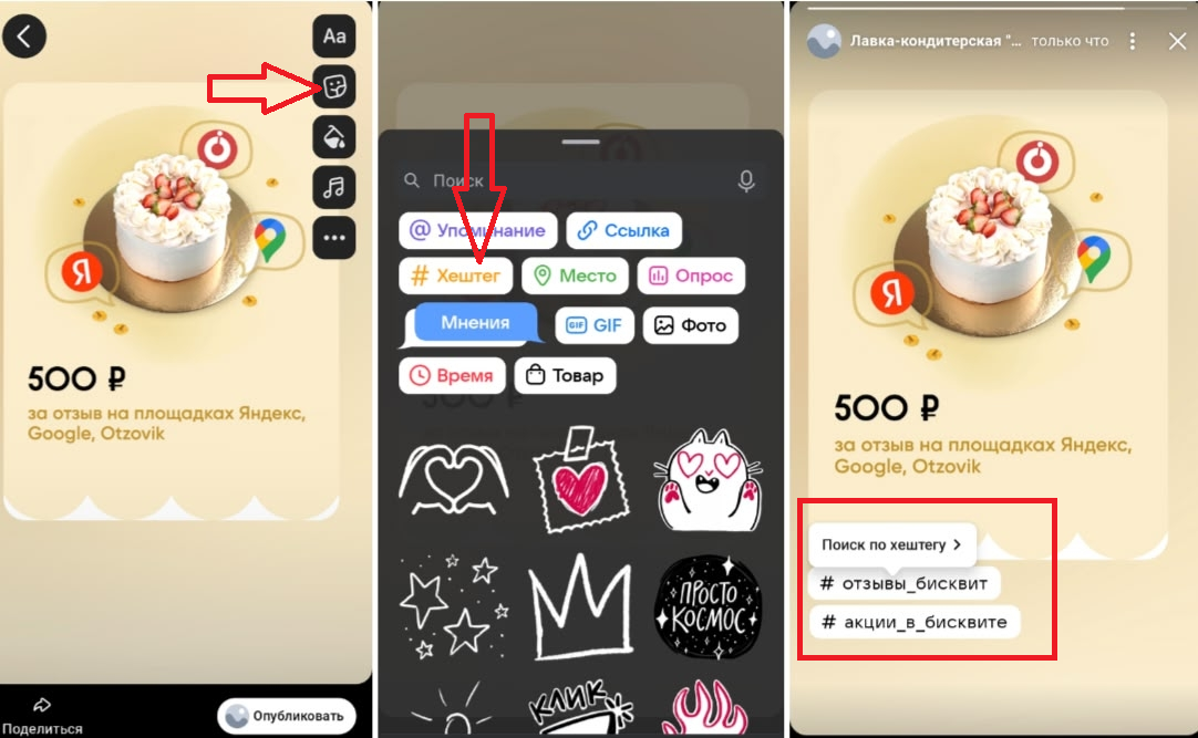 Чтобы прописать хештеги со смартфона, перейдите на свою страницу или в группу и нажмите на кнопку «+ Опубликовать». Далее кликните на строчку «История», загрузите фото или видео, либо репост какой-либо записи. После этого найдите значок «Стикеры» в правом вертикальном меню, он расположен вторым сверху, и в открывшемся меню кликните на строку «#Хештег». Пропишите тег, если нужно добавить ещё один, повторите действия выше, перейдя в «Стикеры», в конце нажмите кнопку «Опубликовать».