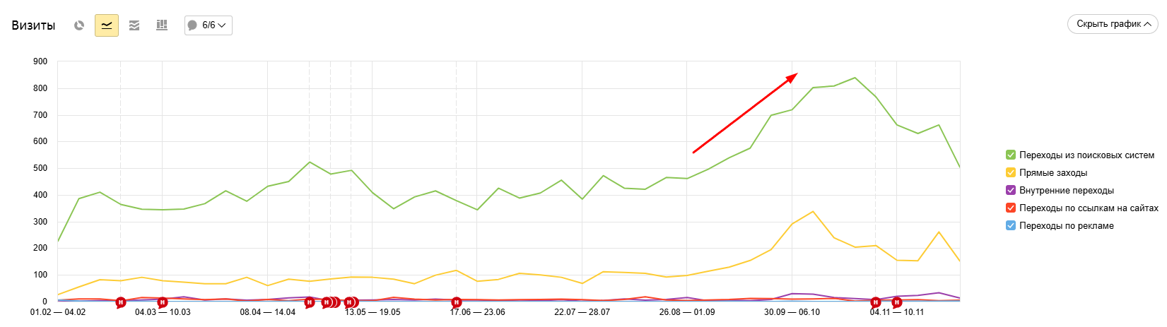 - проанализировать динамику поискового трафика в разрезе конкретных страниц в Яндекс Метрике;