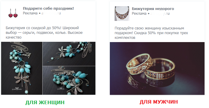 Есть товары, которые считаются чисто женскими или мужскими (например, бижутерия). Но это не означает, что их нужно рекламировать только женщинам. Ведь мужчины покупают бижутерию в качестве подарка. В данном случае выгодно разделить аудиторию на сегменты и показывать разные объявления мужчинам и женщинам.