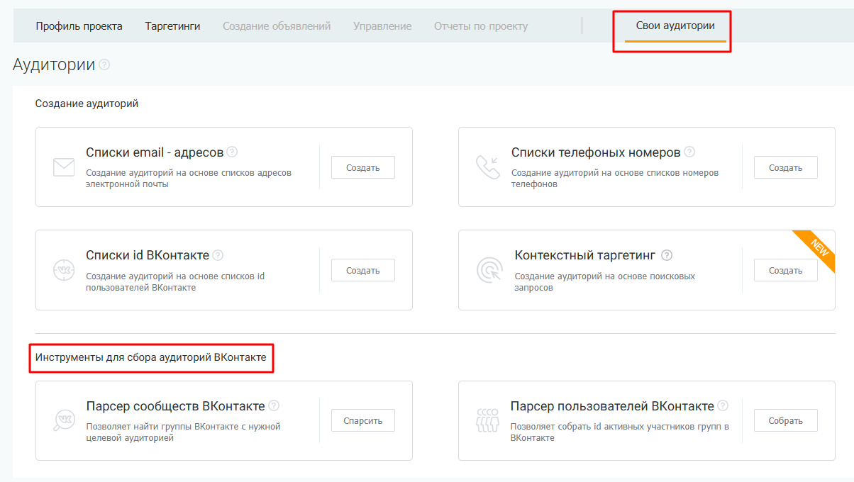 - свои аудитории (на основе email, телефонных номеров, ID ВК).