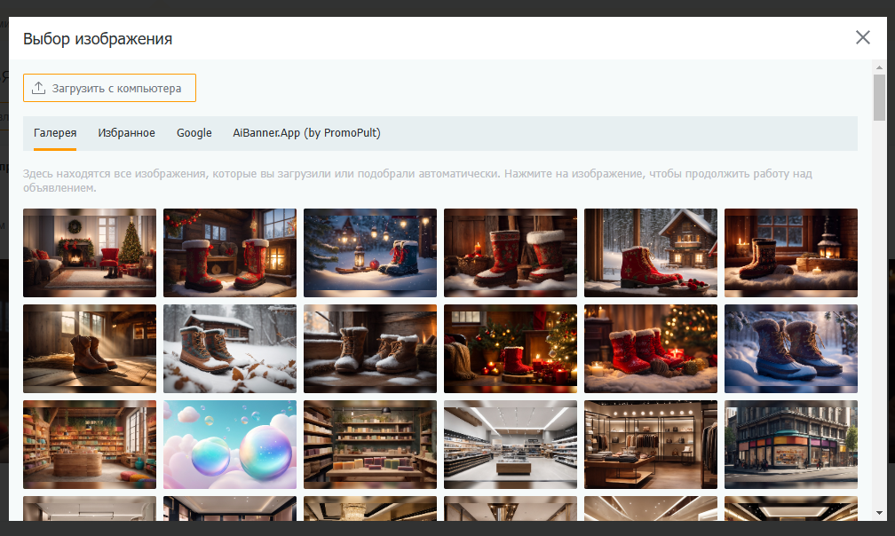 Объявления можно также создать вручную, загрузив креатив с компьютера или используя фото из стоков.