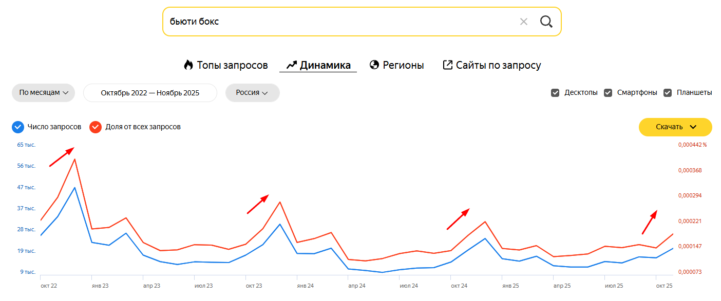 Задайте ключевую фразу, связанную с вашим продуктом, выберите регион и перейдите в раздел «Динамика». Данные отображаются с 2018 года. Так, по ключу «бьюти бокс» спрос растет перед Новым годом.