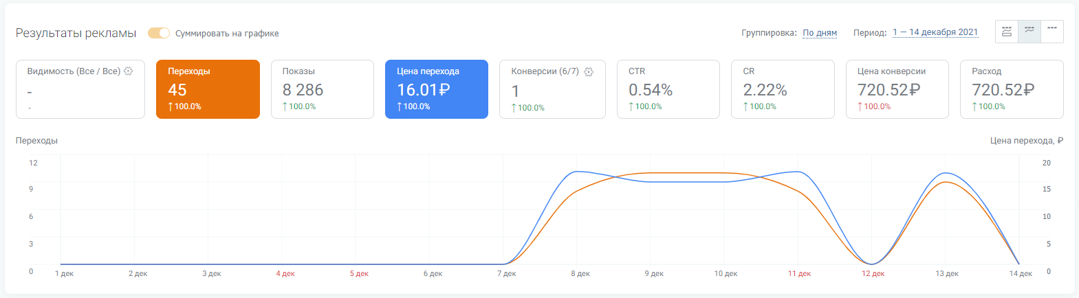 Отслеживать важные показатели эффективности рекламной кампании в PromoPult можно на наглядном дашборде «Результаты рекламы»: